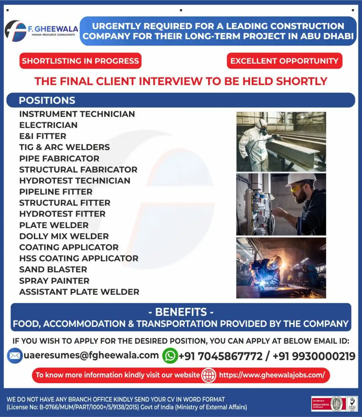 F. Gheewala HR Consultants urgently recruiting for leading construction company in Abu Dhabi. Positions include Instrument Technician, Electrician, Welders, Fabricators, Painters & more. Food, accommodation & transportation provided.