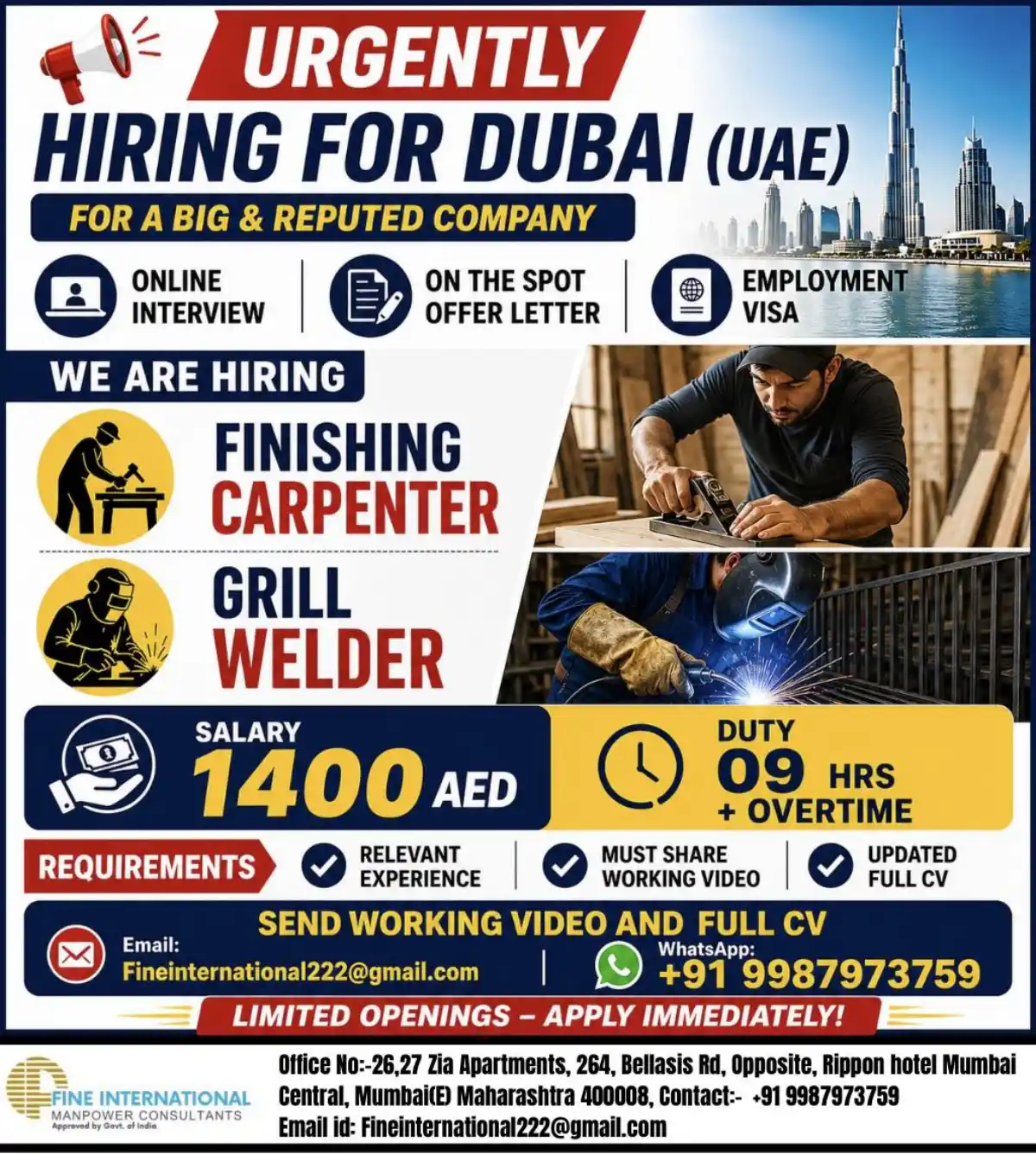 Urgent hiring in Dubai for Finishing Carpenter and Grill Welder. Salary AED 1400 + overtime. Online interview. Send CV and work video. Apply with Fine International Manpower Consultants.
