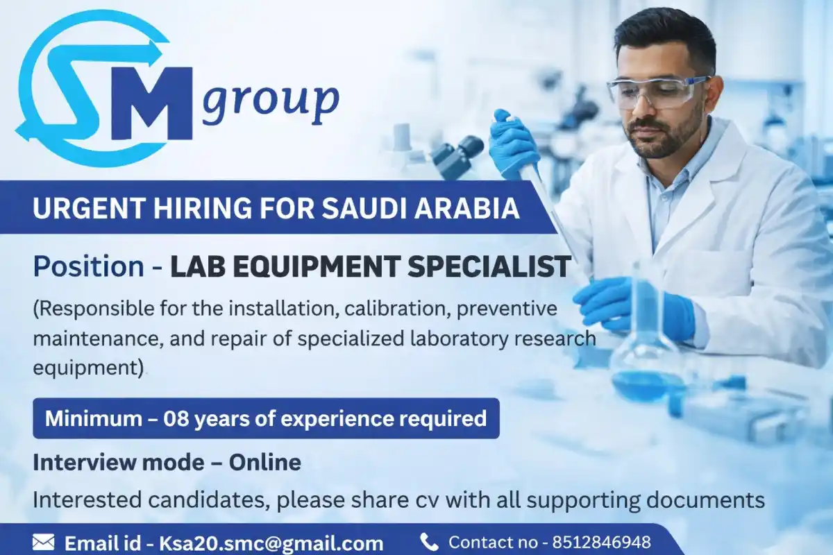 SM Group urgently hiring Lab Equipment Specialist for Saudi Arabia. Minimum 8 years experience required for installation, calibration & maintenance of lab equipment. Online interviews.
