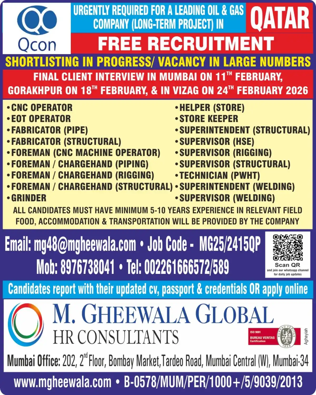 M. Gheewala Global HR Consultants is conducting free recruitment for a long-term project with a leading oil & gas company in Qatar. Shortlisting is in progress, and there are vacancies in large numbers for various positions.