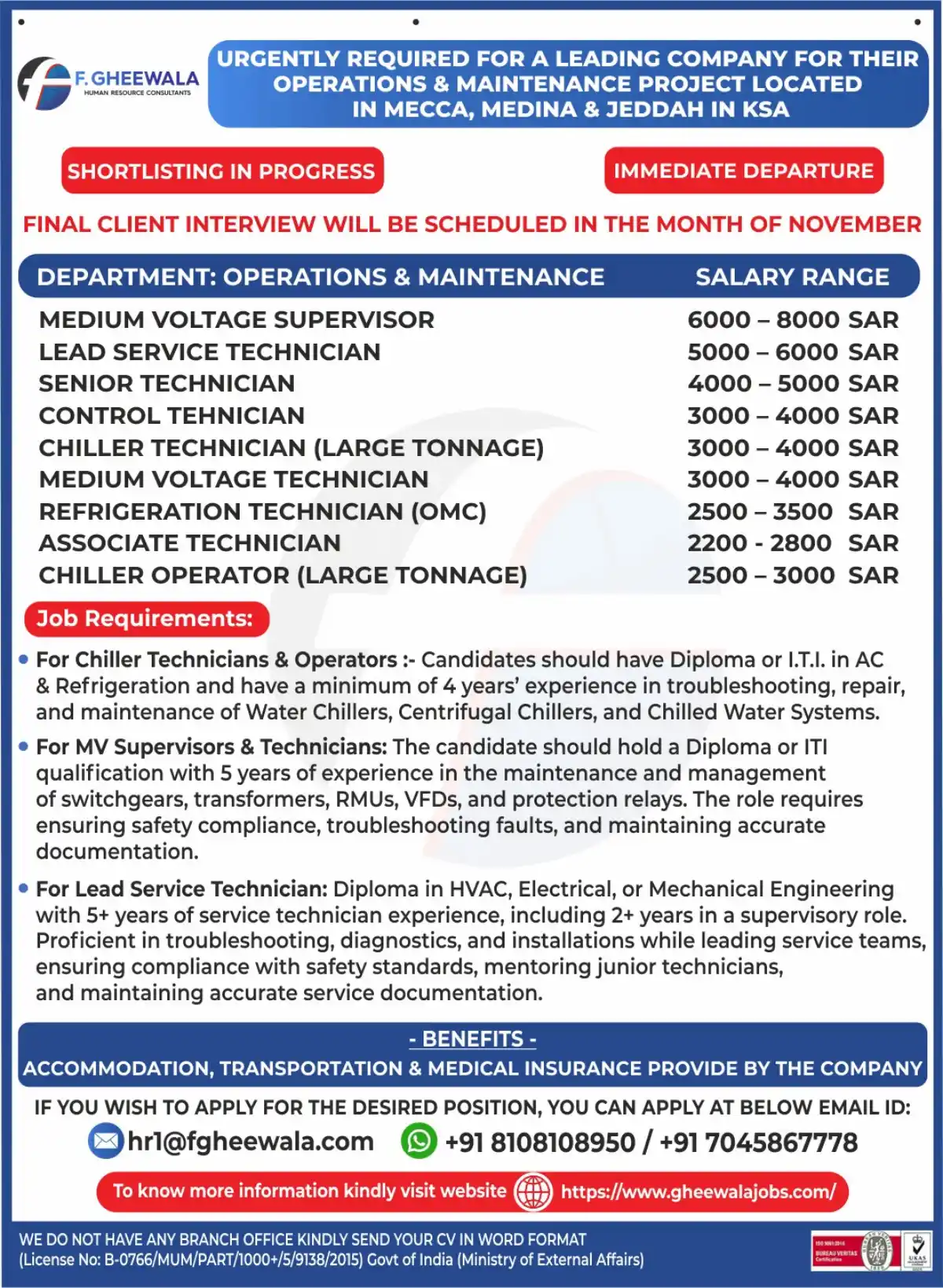 F. GHEEWALA Human Resource Consultants is urgently recruiting for a leading company’s Operations & Maintenance project located in Mecca, Medina, and Jeddah, Saudi Arabia. Shortlisting is in progress, and selected candidates will have immediate departure. Final client interviews are scheduled for November 2023.