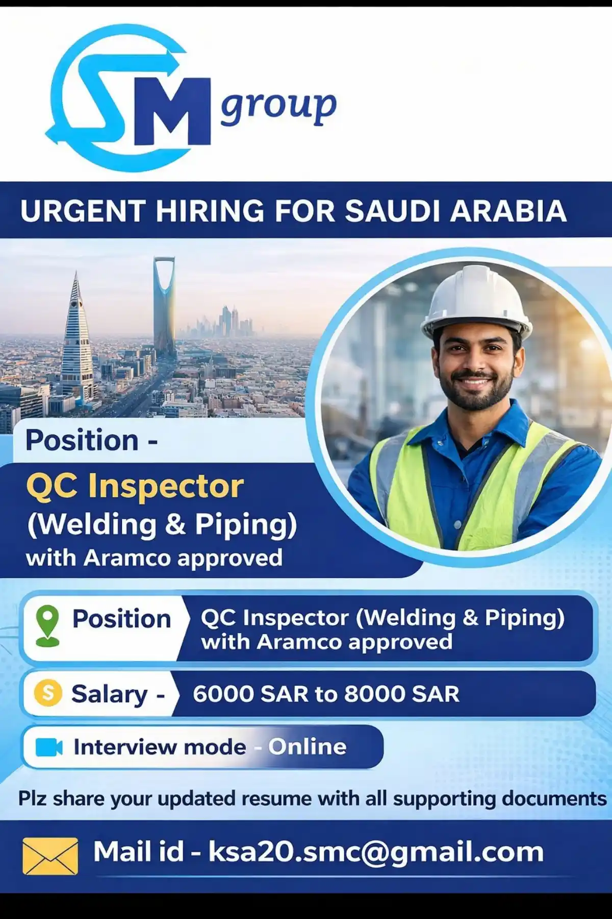 Apply now for QC Inspector (Welding & Piping) position with Aramco approval in Saudi Arabia. Competitive salary 6000-8000 SAR. Online interview. Send resume to ksa20.smc@gmail.com