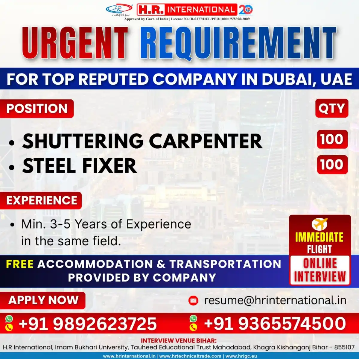 Apply for immediate hiring of Shuttering Carpenters and Steel Fixers in Dubai, UAE. Minimum 3-5 years experience required. Free accommodation and transportation provided. Online interviews available.**H.R. International**, approved by the Government of India (License No: B-0377/DEL/PER/1000+/5/8398/2009), is urgently recruiting for top reputed companies in Dubai, UAE. We have immediate openings for skilled **Shuttering Carpenters** and **Steel Fixers** to join dynamic construction projects.
