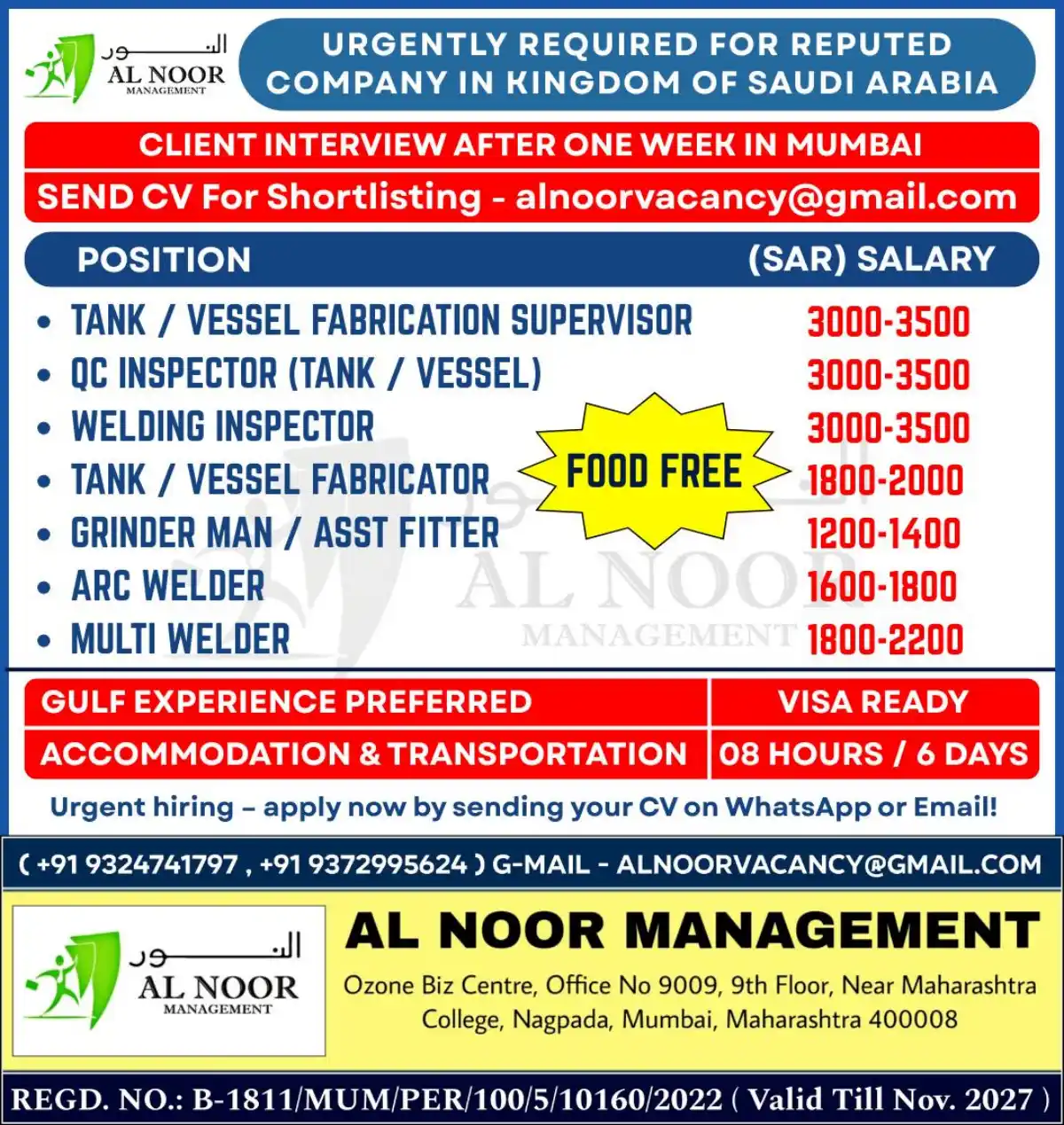AL NOOR MANAGEMENT is urgently recruiting for a reputed company in the Kingdom of Saudi Arabia. Client interviews will be held after one week in Mumbai. This is a great opportunity for skilled professionals in the fabrication and welding industry. Gulf experience is preferred.