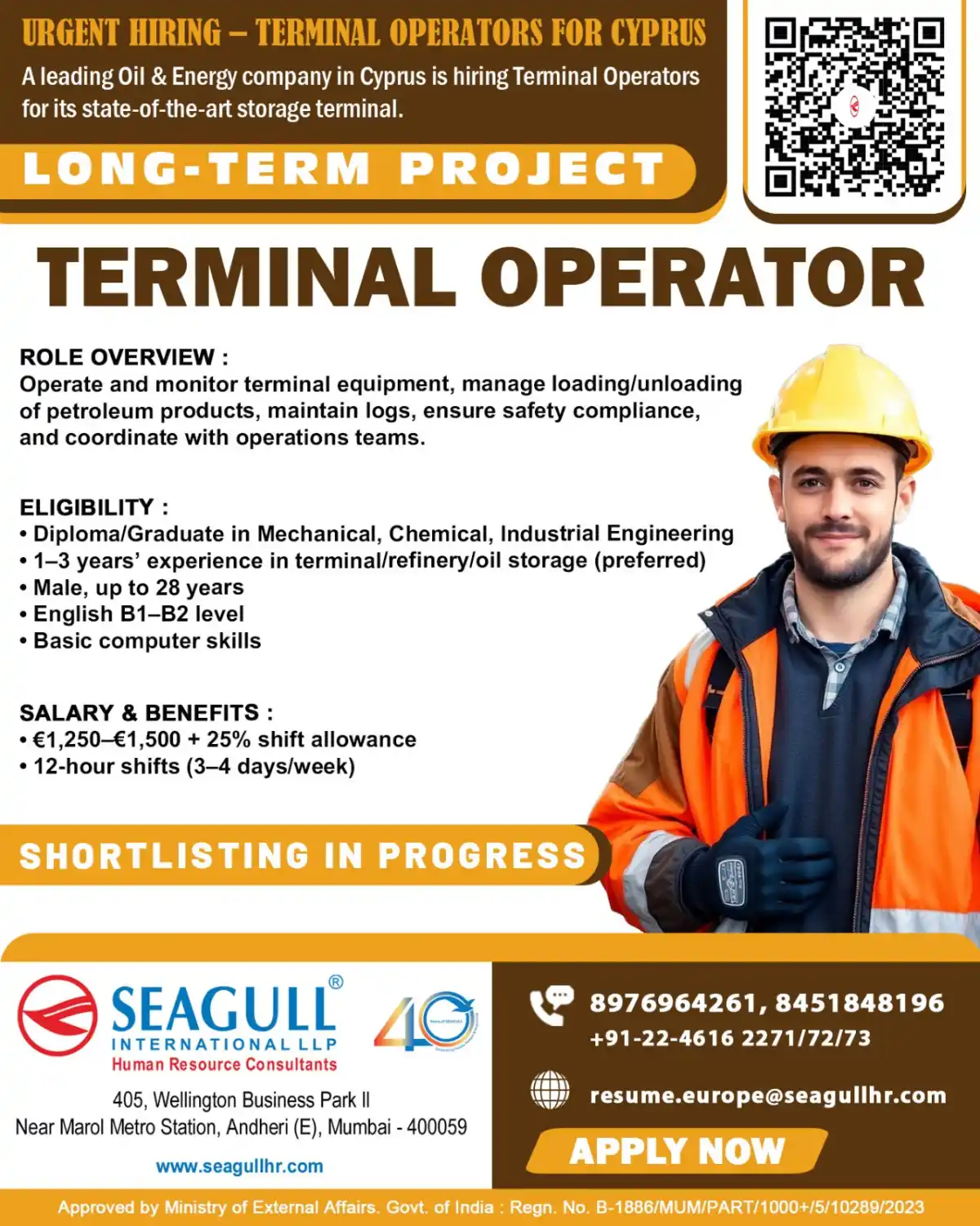 Apply now for Terminal Operator positions in Cyprus. Long-term project with salary €1250-€1500 + 25% shift allowance. Requirements: Engineering diploma, 1-3 years experience in oil terminal operations. Contact Seagull International.