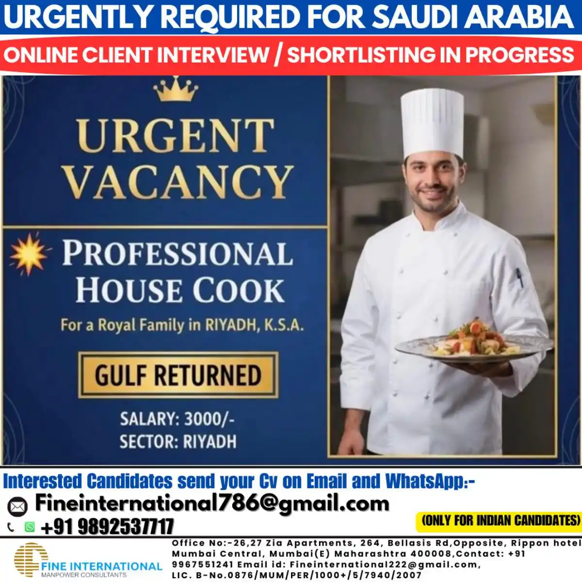 Apply for an urgent house cook job with a royal family in Riyadh, Saudi Arabia. Salary 3000 SAR. Online interviews in progress. Exclusive for Indian candidates. Gulf returned preferred.