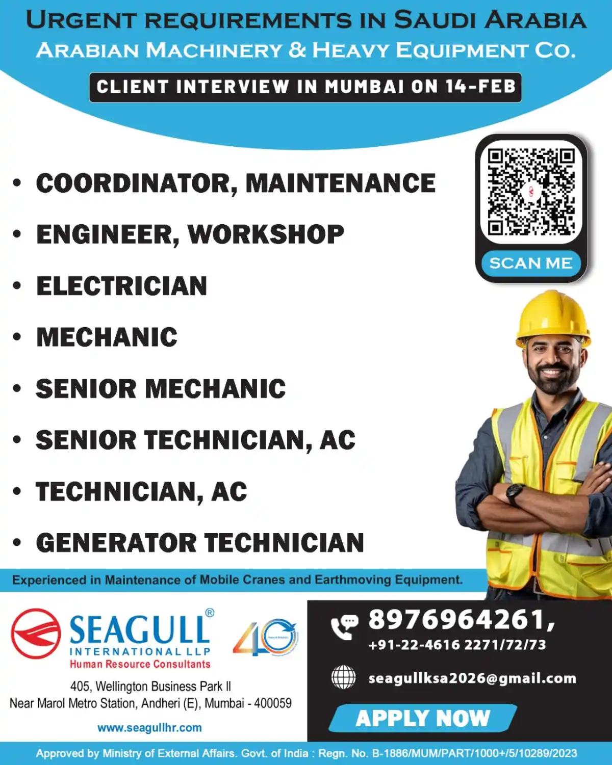 Apply for urgent job vacancies in Saudi Arabia for maintenance roles including Coordinator, Engineer, Electrician, Mechanic, and more. Interview in Mumbai on 14 Feb 2024.Arabian Machinery & Heavy Equipment Co. is seeking experienced professionals for urgent openings in Saudi Arabia.