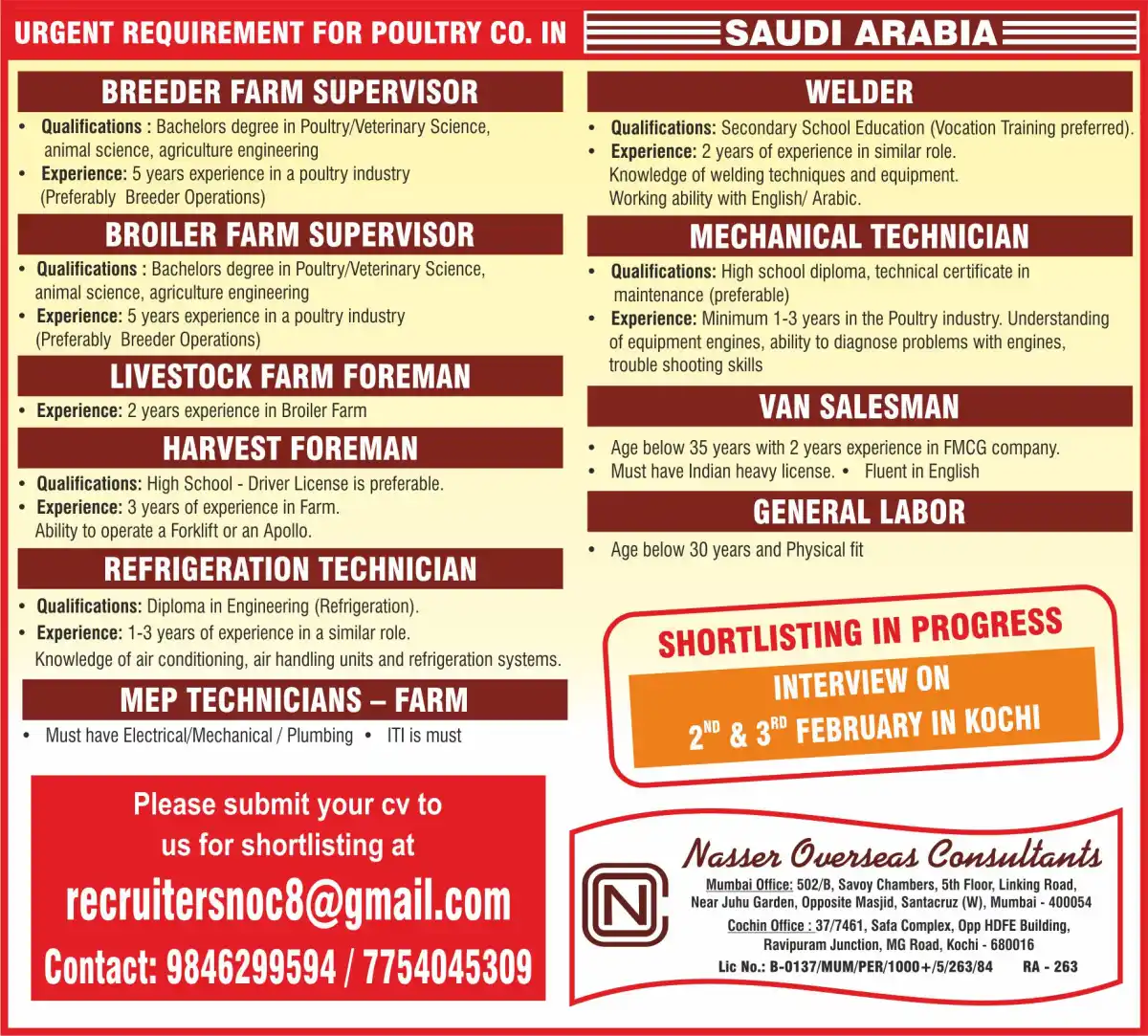 Apply for multiple positions including Breeder Farm Supervisor, Broiler Farm Supervisor, and more at a poultry company in Saudi Arabia. Interviews on 2nd & 3rd Feb in Kochi. Submit CV now.
