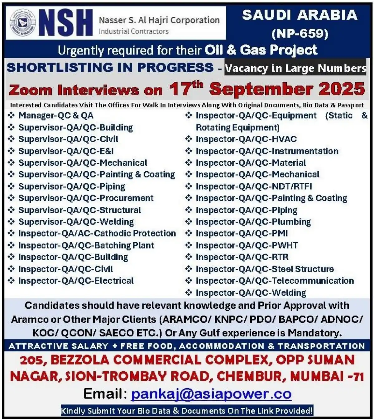 Join Nasser S. Al Hajri Corporation for QA/QC jobs in Saudi Arabia’s Oil & Gas sector. Urgent hiring for Manager, Supervisor, and Inspector roles with prior Aramco approval required. Attractive salary, free accommodation, food, and transportation. Apply now for Zoom interviews on 17th September 2025.