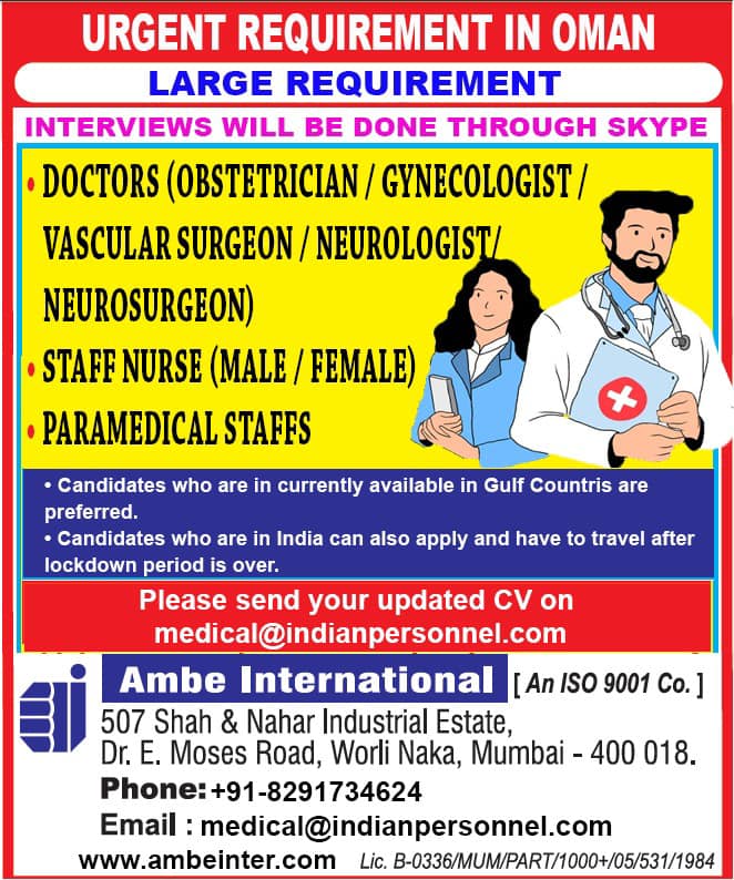 HomeOman JobsUrgent requirement in OmanOman JobsUrgent requirement in OmanBy Gulf JobMay 7, 20200ShareFacebookWhatsApp WhatsApp Group Join WhatsApp There is aurgently required in Oman.Doctors (obstetrician / gynecologist / vascular surgeon / neurologist / neurosurgeon )Staff nurse (male / female)Paramedical staffs All vacancies are for those candidate who is present in Gulf countries. WhatsApp Group Join WhatsApp Previous articleOpportunity for leading company in Saudi ArabiaNext articleWanted for Saudi ArabiaGulf Job