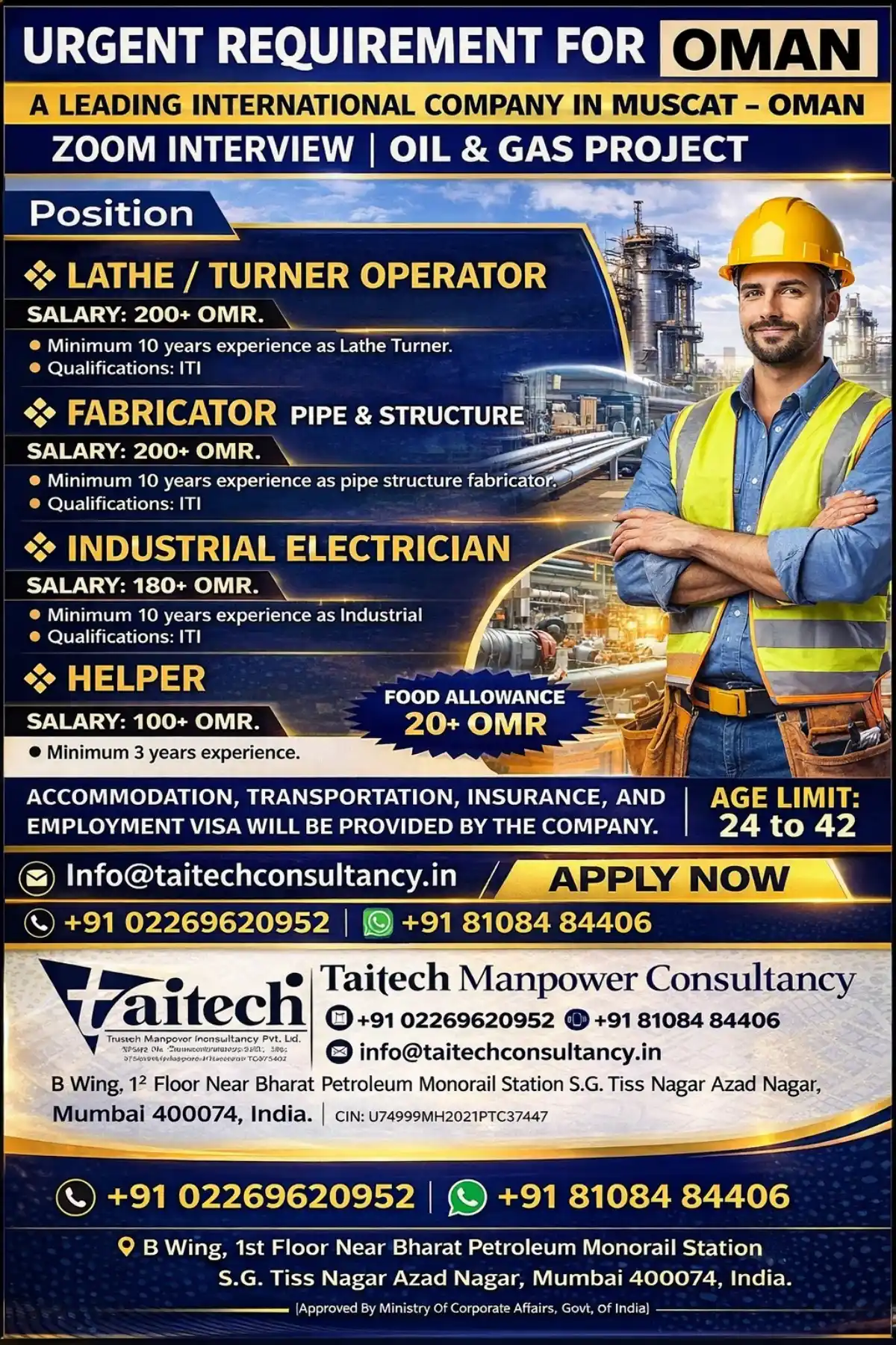 Urgent job openings in Muscat, Oman for Lathe/Turner Operators, Fabricators, Industrial Electricians & Helpers. Oil & Gas project with accommodation, visa, insurance. ITI qualified with 3-10+ years experience. Zoom interview process.