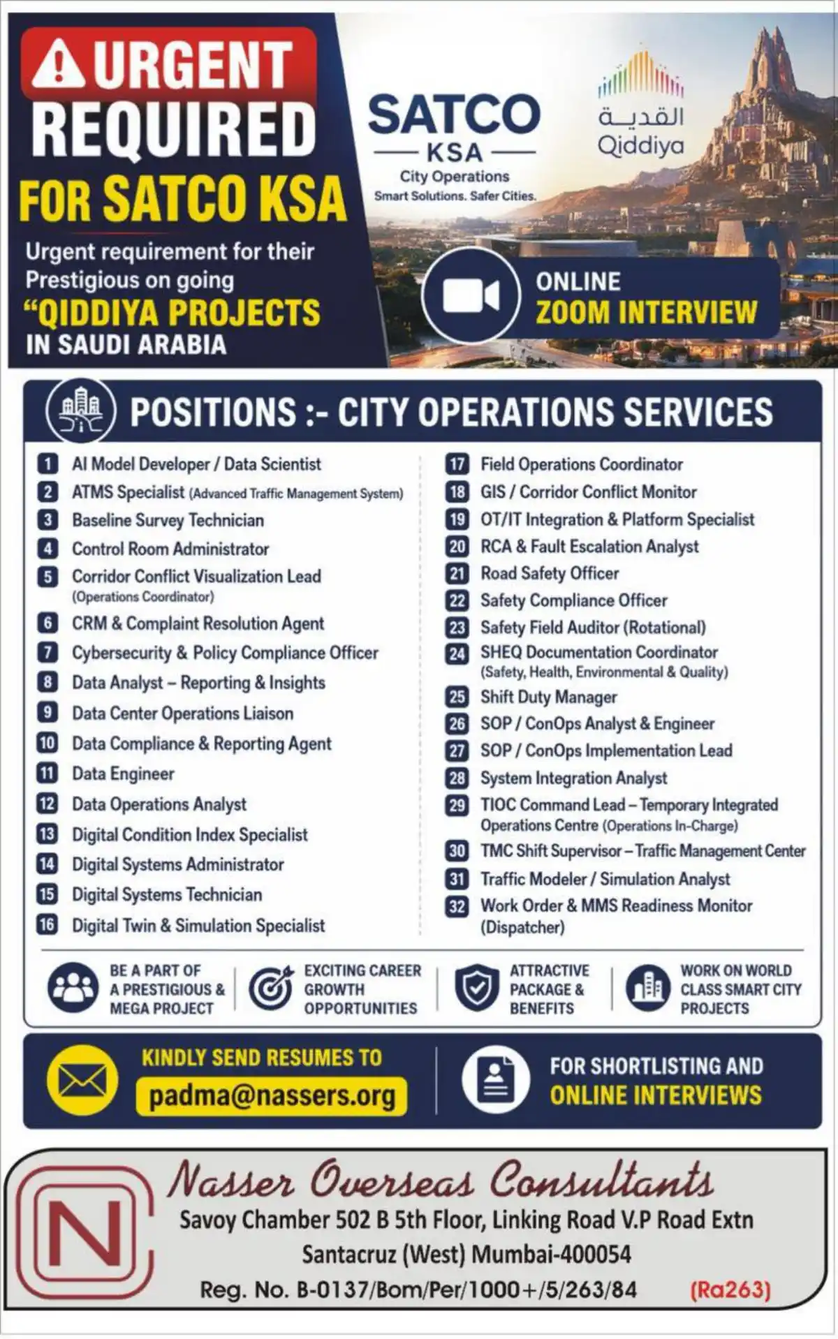 Urgent hiring for SATCO’s Qiddiya Project in Saudi Arabia. 32+ immediate openings in City Operations, Smart City Solutions. Online Zoom interviews. Attractive packages & benefits.