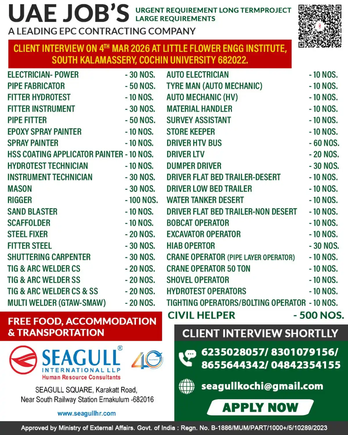 A leading EPC contracting company in the UAE is urgently hiring for a long-term project. We have large requirements for various positions, and client interviews are scheduled for 4th March 2026 at Little Flower Engineering Institute, South Kalamassery, Cochin University 682022.