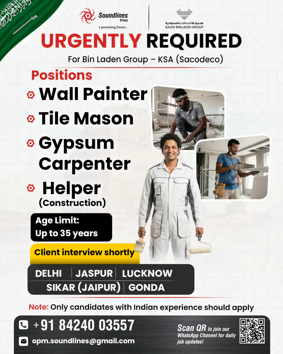Soundlines Group, in collaboration with Saudi Binladin Group (Sacodeco project), is urgently seeking qualified construction professionals for immediate deployment to the Kingdom of Saudi Arabia. We have multiple vacancies available for skilled workers who possess relevant Indian construction experience.