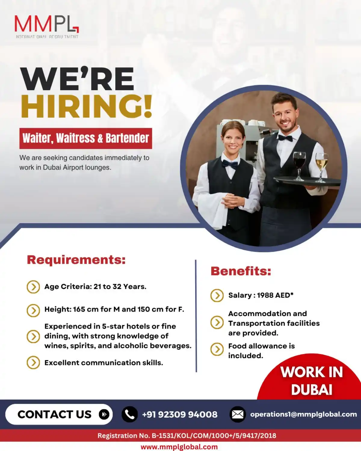 Apply for waiter, waitress, and bartender jobs in Dubai Airport lounges with MMPL International Recruitment. Salary 1988 AED, accommodation, transport, and food allowance provided. Contact operations1@mmplglobal.com or call +91 92309 94008.