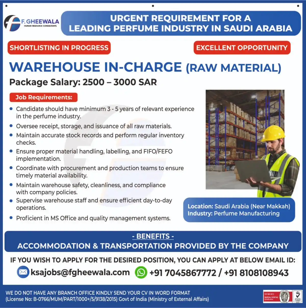 Apply for Warehouse In-Charge position in Saudi Arabia’s perfume industry. Salary 2500-3000 SAR, accommodation & transport provided. 3-5 years experience required. Contact F. Gheewala HR Consultants.