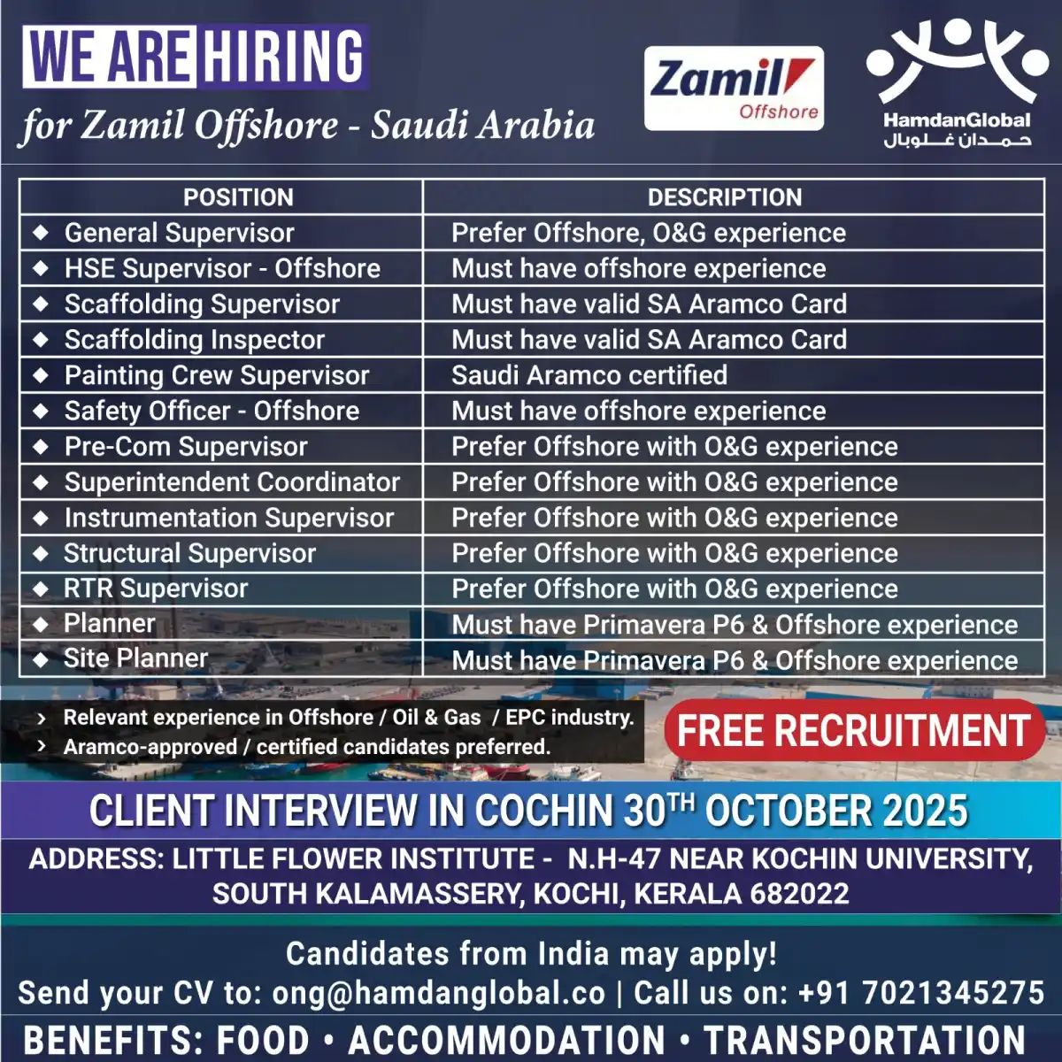 Apply for offshore positions at Zamil Offshore in Saudi Arabia. Must have offshore and Saudi Aramco experience. Interview in Cochin on October 30, 2025. Free recruitment with benefits.